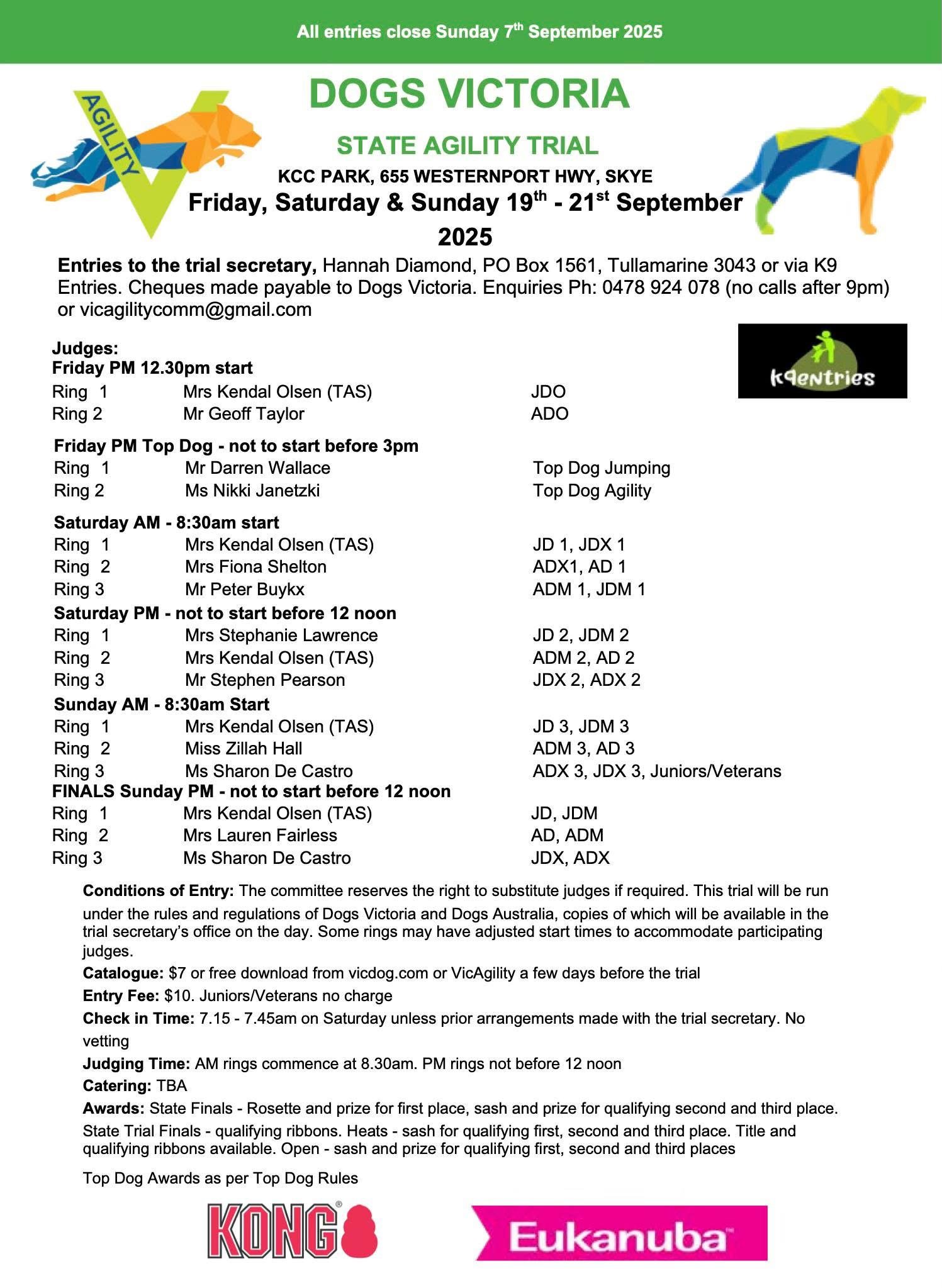 Victorian Trials & Tests for Obedience, Rally, Agility, Herding, DWD, Tricks, Tracking, Track & Search, Endurance, Luring Coursing & Racing and Scent Work
