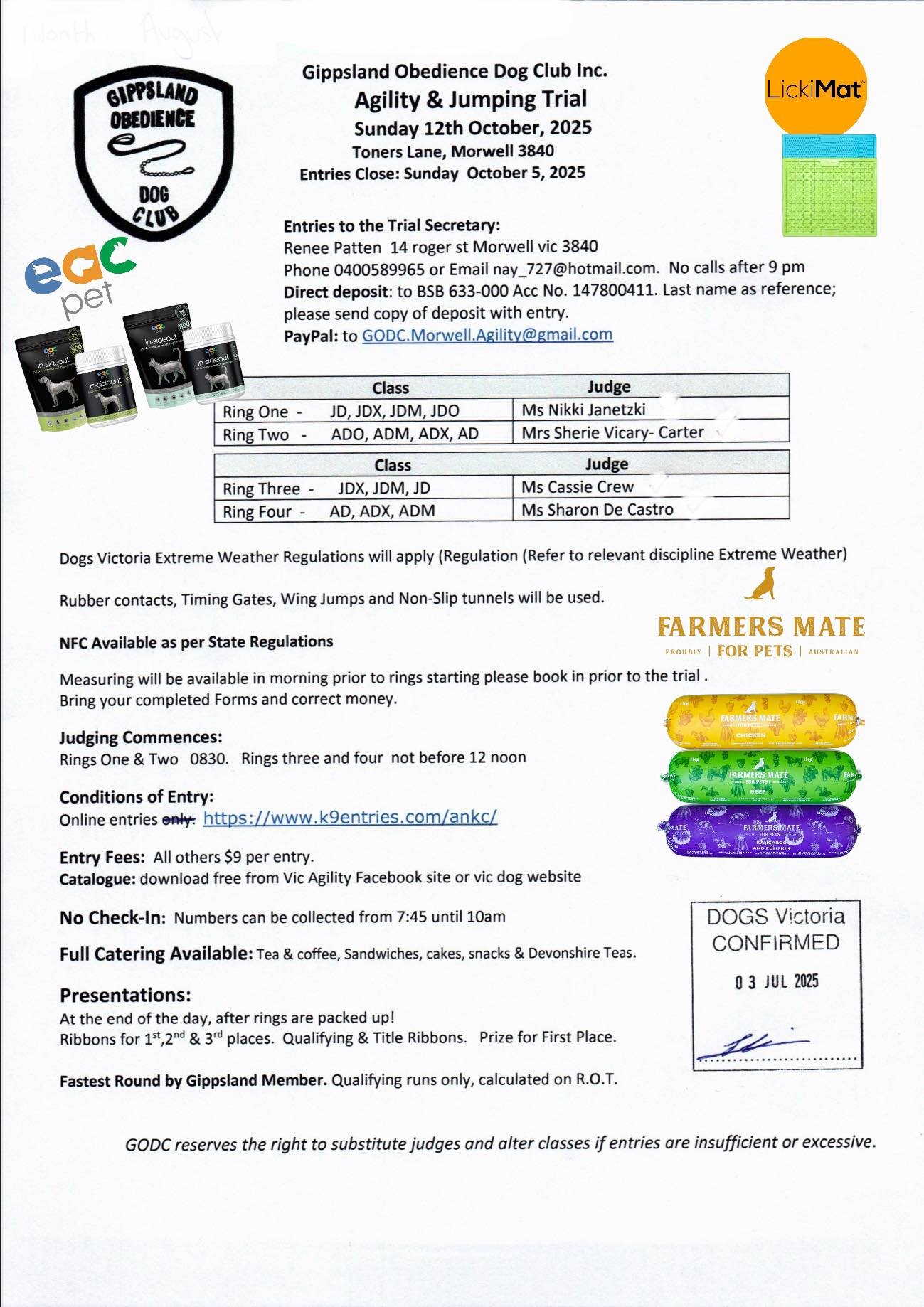 Date 12/Oct/2025 Time 7:00 AM - 7:00 PM Labels - SCHEDULE -,Agility Gippsland Obedience Dog Club – Agility & Jumping Trial Schedule Closing Date: 5 October 2025 + Add to Google Calendar + iCal / Outlook export 00 days 00 hours 00 minutes 00 seconds
